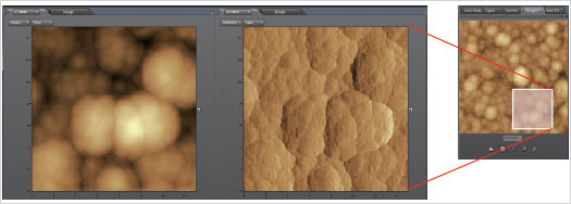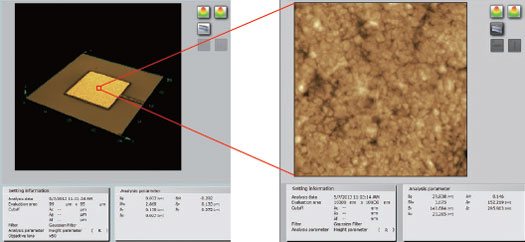 | ![]() Si電路板上的SiO2圖案樣品。高度影像(左)中 顯示為黃色的部分是SiO2。在電流影像(右)中 顯示為藍(lán)色(電流不經(jīng)過的部分)。通過上圖, 可以明確電路板中也存在電流不經(jīng)過的部分。 |