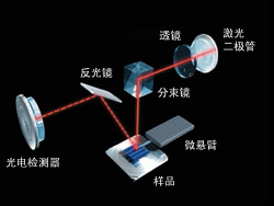 SPM傳感器光路圖 | OLS4500上采用了光杠桿法——通過高靈敏度檢測出最前端裝有探針的微懸臂的微小彎曲量(位移)來進(jìn)行觀測的方法。在懸臂的背面反射激光,并用壓電元件驅(qū)動Z軸,使激光照射到光電檢測器的指定位置,從而正確讀取Z方向的微小位移。 |