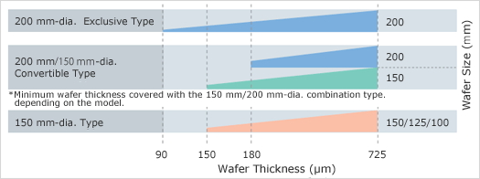 我們推出了200 mm專用型、200 mm/150 mm兼用型和150 mm型(對(duì)應(yīng)小于150 mm的晶圓)的3種型號(hào)。除此以外,您還可以根據(jù)檢查模式,選用微觀檢查專用型號(hào)"L型"或微觀?宏觀檢查兼用型號(hào)"LMB型"。