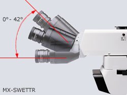 備有2種能以舒適姿勢觀察的傾斜鏡筒??梢愿鶕?jù)用途選擇雙目部傾斜角度由水平0°到42°的、變化范圍大的MX-SWETTR型號,或是目視和拍攝影像可同時觀察的U-SWETTR-5型號。 |