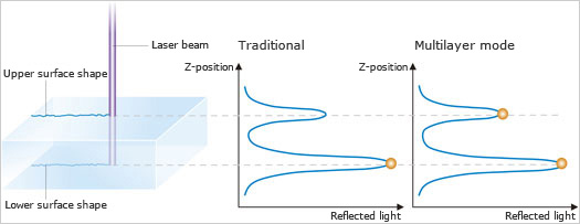 過去,激光顯微鏡焦點的位置都會設(shè)置在樣品上反射光強度最大的區(qū)域。但是,這樣的設(shè)計有時候會很難識別透明樣品的正確形狀,因為激光光束會直接穿過樣品。LEXT OLS4000 全新的多層模式則可以識別多層樣品各層上反射光強度的峰值區(qū)域,并將各層設(shè)為焦點,這樣即可實現(xiàn)對透明樣品上表面的觀察和測量,而且也可以對多層樣品的各層進(jìn)行分析和厚度測量。